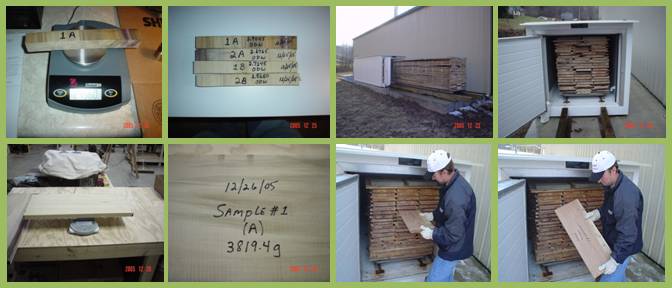The sample board weight method of moisture content is accomplished by selecting boards during the stack and sticker process to use as samples. In this case a 30 inch or longer piece is cut from each of two 12 foot long boards. A one inch piece is cut from each end, weighed then placed in an oven and periodically weighed. When there is no further weight loss the samples are at their "Oven Dried Weight" (ODW). The difference of the sample weight before and after oven drying is used in calculating each sample's moisture content as a percentage of overall weight (MC%). The top first and second pictures from the left show one of the peices being weighed and the four samples marked with their data. The bottom two pictures left to right show one of the two kiln samples beign weighed and documented.